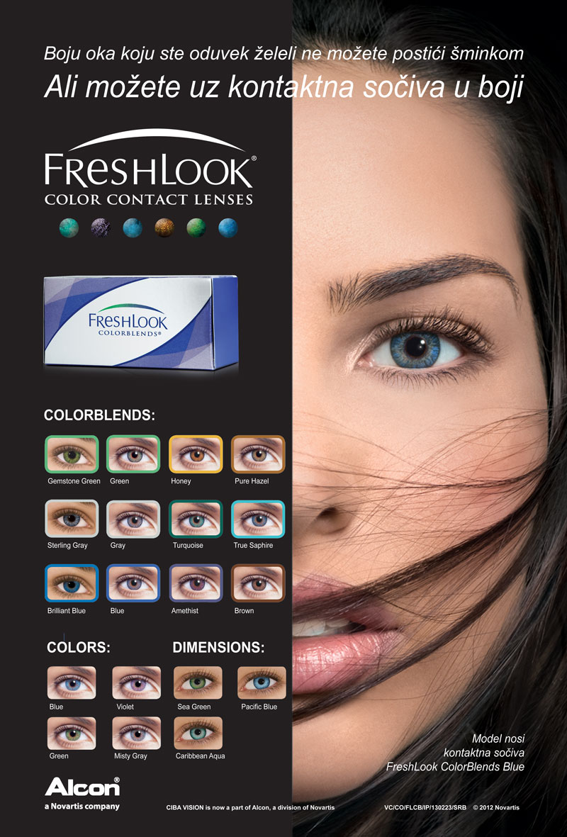 Kontaktna sočiva u boji su veoma popularna, a medju njima najpopularnija su sočiva u boji FRESHLOOK®. Boju oka mogu promeniti izrazito, umereno ili je samo naglasiti. Sočiva koja izrazito menjaju boju oka izrađena su tako da obojeni deo sočiva u potpunosti prekriva prirodnu boju dužice, dok sočiva koja boju menjaju umerenije dopuštaju da se prirodna boja oka blago nazire, što deluje prirodnije, a daje fantastičan efekat i izražajnost oku. Upotpunjuju vaš modni stil ili pokreću na promene, čineći vas sigurnijim i zadovoljnijim.