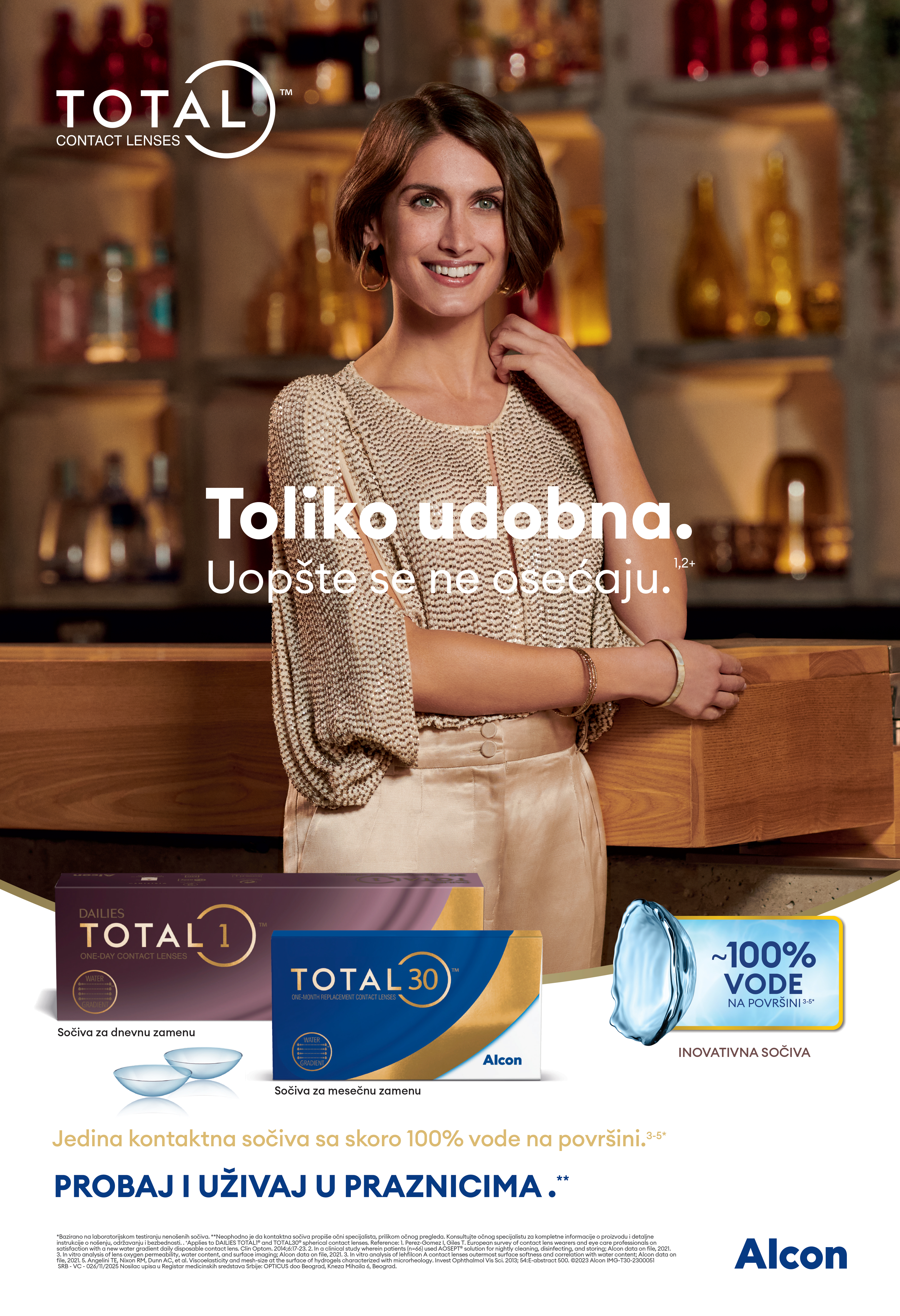Konsultujte svog očnog specijalistu i probajte mesečna TOTAL30 kontaktna sočiva koja dostižu 100% vode na površini sočiva, pa oko ne dodiruje sočivo nego prijatna vlažna obloga. Uverite se u fantastičan komfor i kvalitet vida uz kontaktna sočiva koja se uopšte ne osećaju na oku.